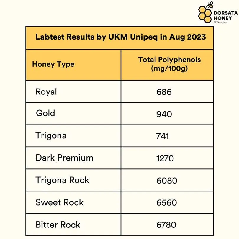 The centuries-old ancient trees and diverse vegetation within Malaysia's rainforest contribute to the heightened amount of polyphenols found in Dorsata Rock Honey, exceeding normal honey in the market by at least 100 times! Classified as medicinal honey, Dorsata Rock Honey offers potent healing properties, including benefits for diabetic patients.