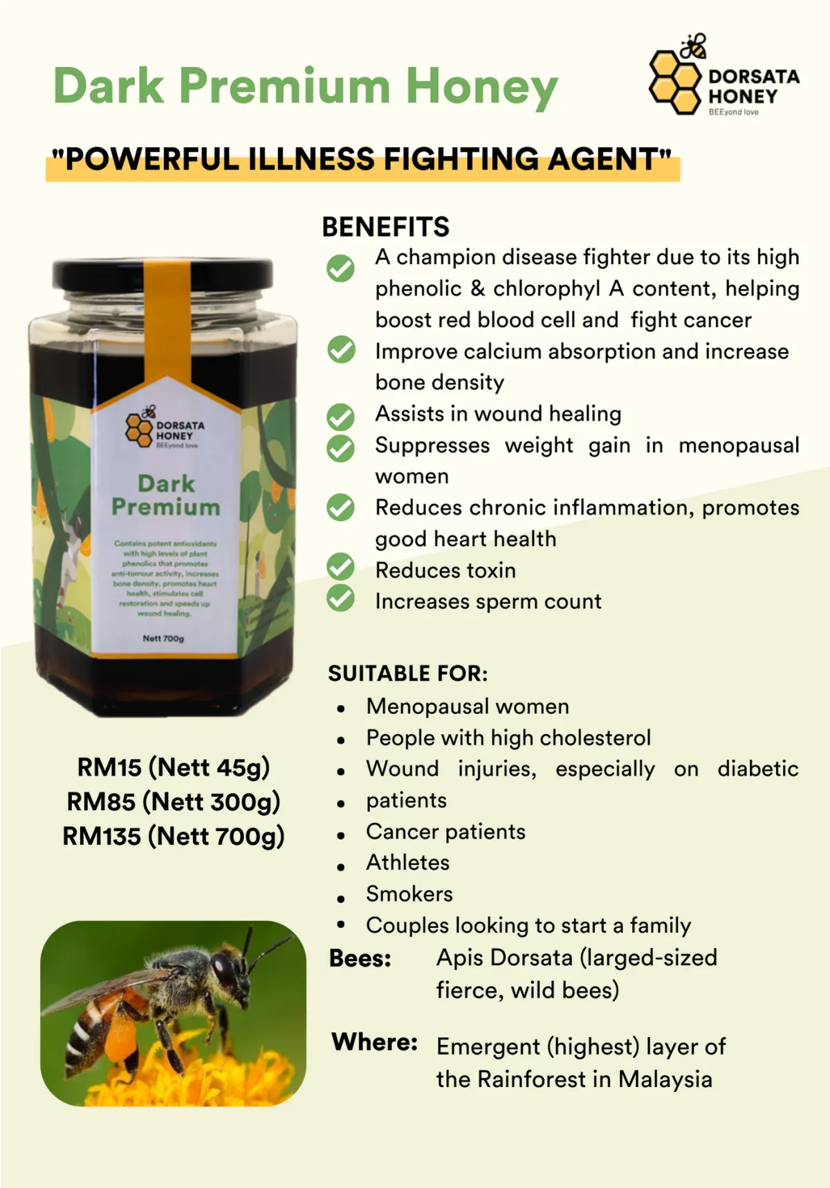 Dorsata Rock Honey is a precious treasure harvested from wild honeybee hives nestled deep within Malaysia's lush rainforests. These wild giant honeybees are vital to the rainforest's delicate ecosystem, serving as its foundation.