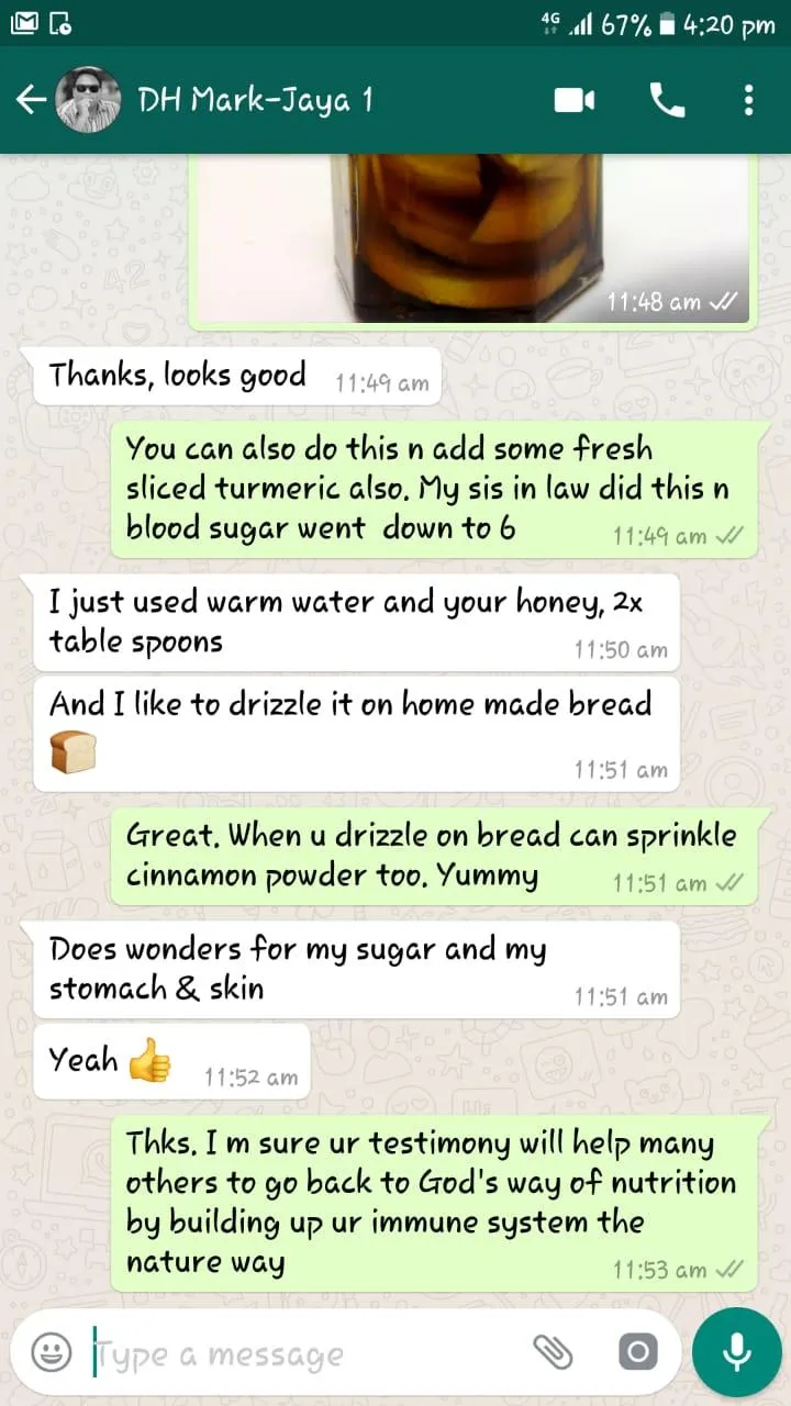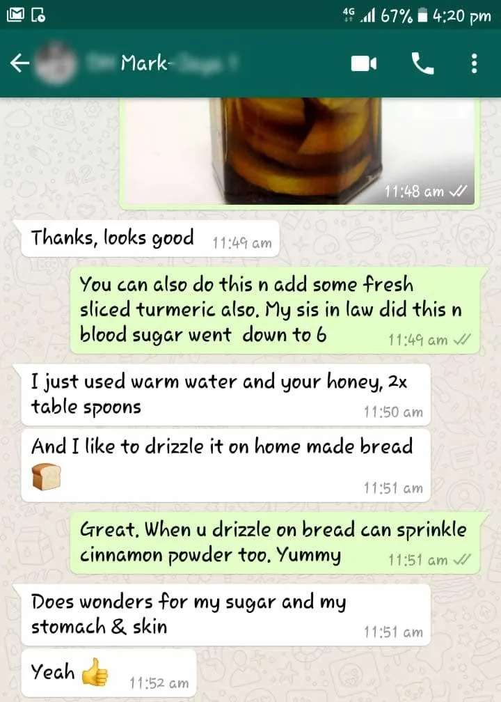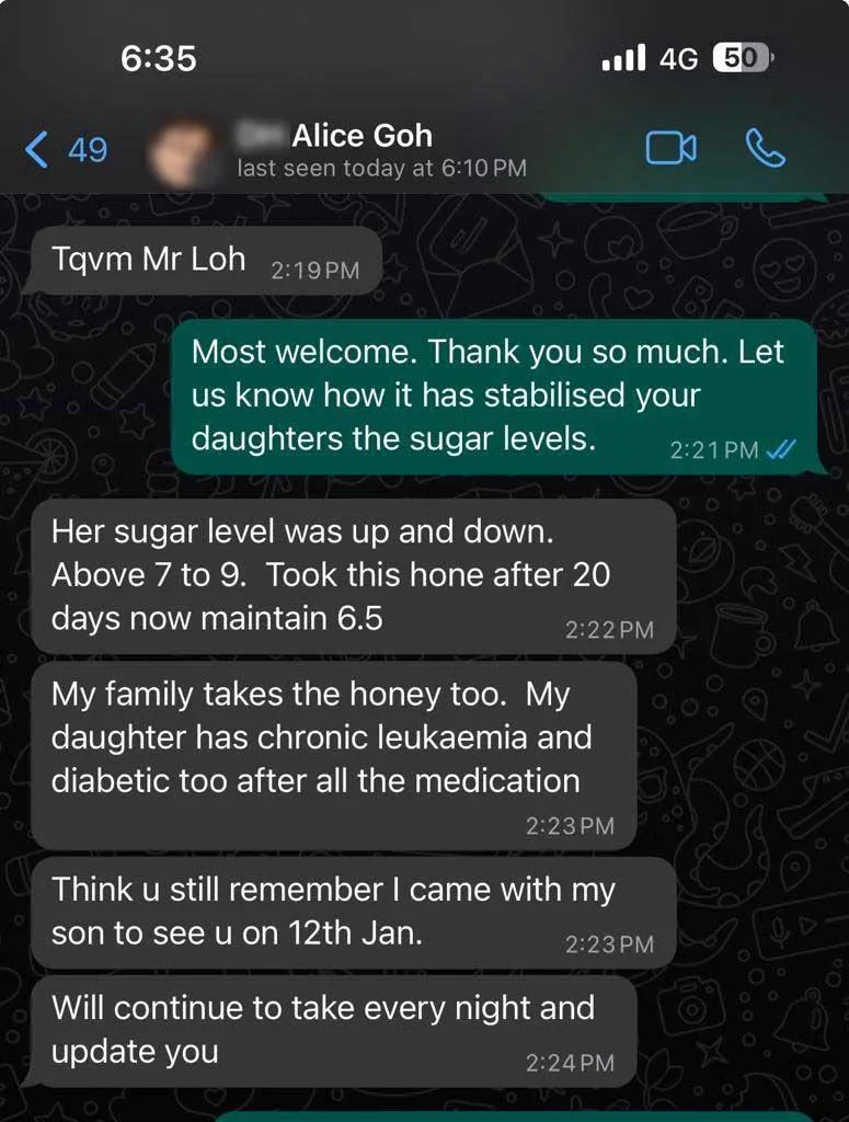 Madam Alice's daughter has been grappling with chronic leukemia alongside diabetes. Her condition had led to erratic fluctuations in her blood sugar levels, ranging between 7 to 9. After incorporating Dorsata Rock Honey into her regimen for 20 days, her blood sugar has remarkably stabilized at 6.5.