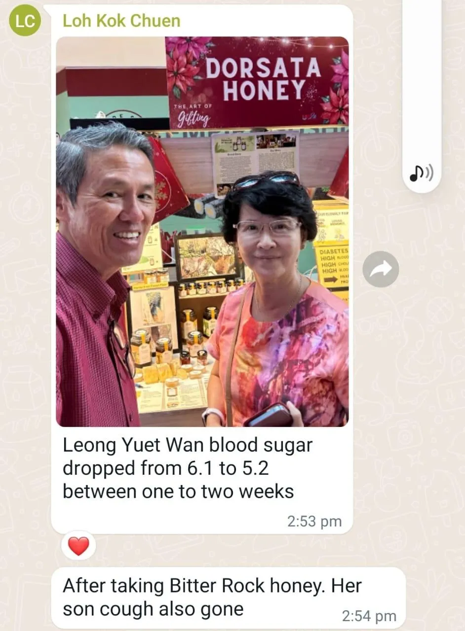 Madam Yuet Wan experienced a drop in her blood sugar levels from 6.1 to 5.2 within approximately 10 days and her son's cough also improved after both of them consume Dorsata Rock Honey