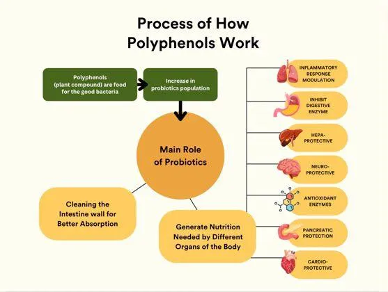 Polyphenols have been studied by National Institute of Health, United States (NIH) and found to offer numerous health benefits including improve immune function, lowering the risk of chronic diseases such as heart disease, cancer, diabetes, and neurodegenerative disorders. They also support gut health by acting as prebiotics, promoting the growth of beneficial gut bacteria and clean up our intestine naturally, allowing better absorption of nutrients. (Link to NIH study on polyphenols against development of cancers, cardiovascular diseases, diabetes, and more.)