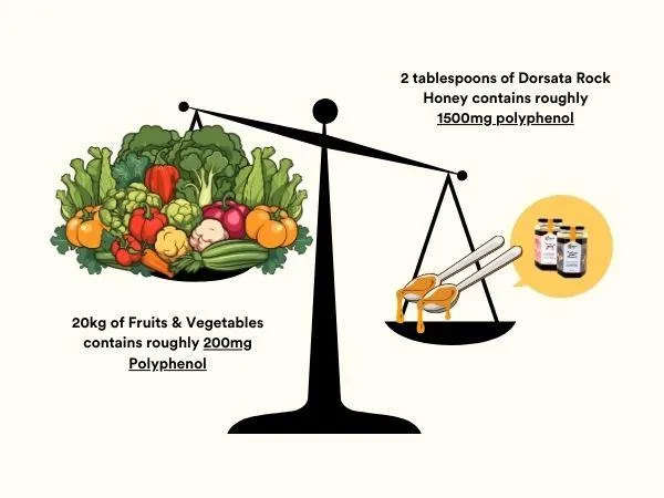 Polyphenols, the natural compounds abundant in Dorsata Rock Honey (>6500mg Polyphenols/100g Honey), play a crucial role in promoting human health. These powerful antioxidants help combat oxidative stress and inflammation in the body, reducing the risk of chronic diseases such as heart disease, cancer, and diabetes. Moreover, polyphenols support overall well-being by enhancing immune function, supporting gut health, and promoting longevity. Plants create polyphenols as a natural defense mechanism against UV radiation, pests, and diseases. When consumed by humans, these compounds offer significant health benefits.